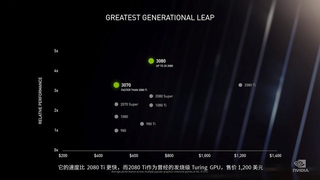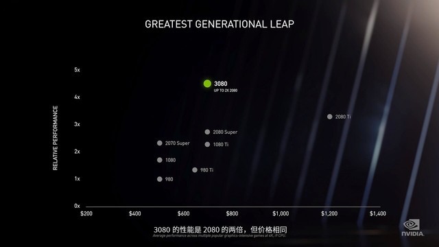 首先这张图上纵坐标为Relative Performance 相对性能,横坐标为价格,单位为美元,这些都很清晰,图上确实可以看到3080的价格大约在700美元左右,2080Ti价格约1200美元。性能上,以980的性能为1,3080的性能大约为4.5倍,2080Ti约为3.1倍,性能确实相差很多,对比一下2080Super的2.7倍左右,这样来讲3080是2080性能的两倍确实没有什么太大的问题(2080Super毕竟还是要比2080强一些,并且这里都经过了四舍五入,约两倍这个概念是站得住脚的)。这样来看,目前售价还在五六千元人民币的2080以及高达万元的2080Ti似乎真的没有任何性价比。