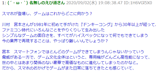 ·谈论的话题是手游之于游戏的前景,首先川村(川村元气,日本东宝株式会社电影制作人、小说家)向宫本茂发问,提到了宫本茂自1981年着手开发的《大金刚》以来,至今已经遍历各种游戏近40年,从FC时代诞生的那种“纯粹”的游趣在如今一切都已经超高规格的时代反而难以实现了?