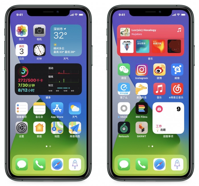 在体验 iOS 14 的这段时间里,我的主屏幕页面由之前 iOS 13 的五页缩减到了如今的两页(不包括 App 资源库):第一页为常用的原生应用,包括相机、相册、备忘录、地图等;第二页为常用的非原生应用,包括微信、微博、VSCO 等。其他不常用的应用我都会通过 App 资源库或者直接通过下住屏幕搜索打开,应用的整理和使用效率有了很大的提升。