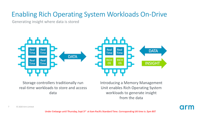 微架构的另一大变化是加入了MMU,这使得Cortex-82实际上可以作为Linux等丰富操作系统的通用CPU。如果处理器可以自己运行自己的操作系统,这对于-R系列未来的目标市场可能性来说,其实是一个相当大的变化。Arm的产品介绍主要集中在存储控制器上,既能像现在这样运行实时工作负载,又能加入丰富的操作系统,以实现更复杂的算法和更高层次的应用,而这些在裸机和实时操作系统上是不太可行的。