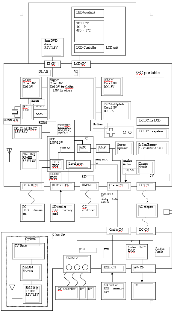在最近泄露的任天堂内部文件中,有国外网友发现一个名为GC portable的设计图,这里面的GC很明显就是指NGC,而Portable的意思则代表掌机/便携设备。该设备使用和PSP一样的480*272分辨率屏幕,支持NGC独家的8cm DVD光碟、使用与NGC相同的Gekko芯片、支持WiFi、立体声、SD卡和USB连接,使用两块2000mAh电池。