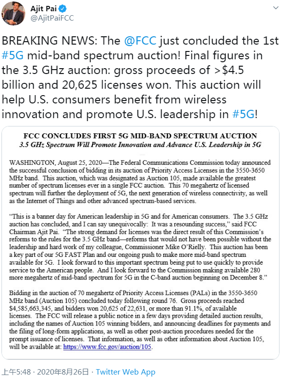 最后,FCC 表示,中标机构必须在 9 月 17 日前缴清首付(总竞标金额的 20%),并在 2020 年 10 月 1 日前补足剩余款项。