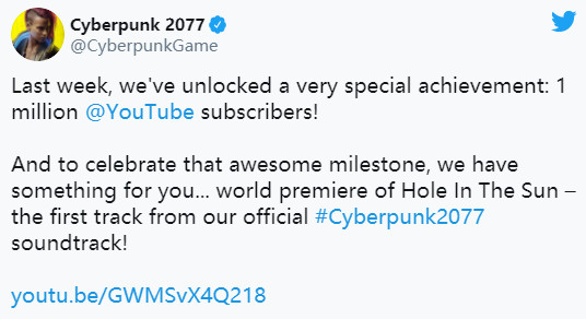 昨晚《赛博朋克2077》官推宣布《赛博朋克2077》官方油管频道正式达到100万人订阅。为了庆祝这一里程碑,CDPR决定释出《赛博朋克2077》的首个原声音乐专辑中的第一首《Hole In The Sun》。