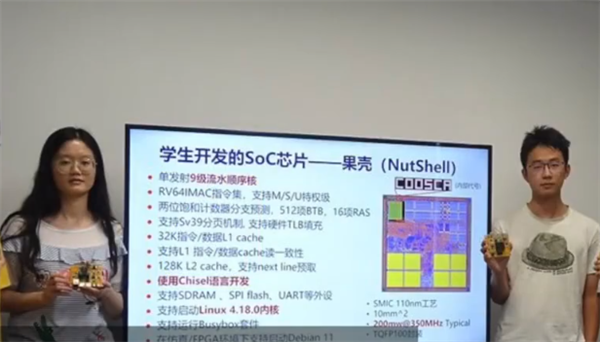 最近,有消息称,中国科学院大学五位2016级本科生,仅用4个月就主导完成了一款64位RISC-V处理器SoC芯片设计并实现流片。据悉,这款芯片被命名为果壳(Nutshell),成为了他们最硬核的毕业证书。消息曝光后,引发网友关注和质疑。据国内媒体报道,9月3日,成员之一王华强代表团队向全球同行介绍了果壳的设计。这也是果壳首次在国际舞台上亮相。