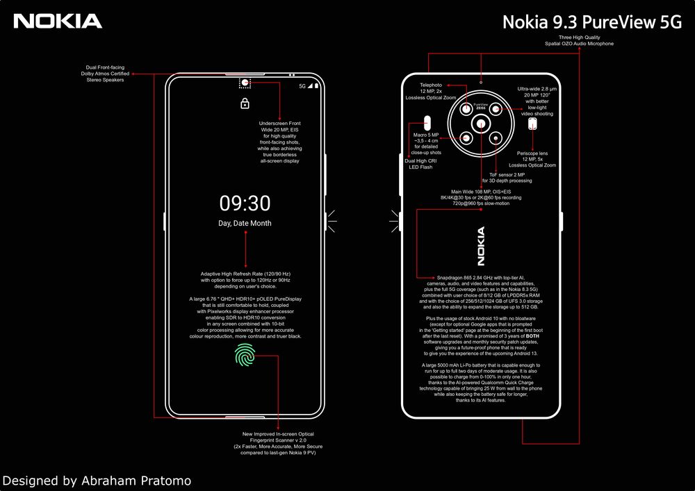 外媒letsgodigital绘制的诺基亚9.3 PureView概念渲染图