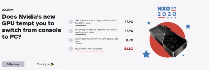 为此,IGN在网站上做了一个调查,数据显示超一半的玩家(52.7%)仍然不为所动,坚持自己的主机平台。只有17.8%的玩家表示会转投PC。