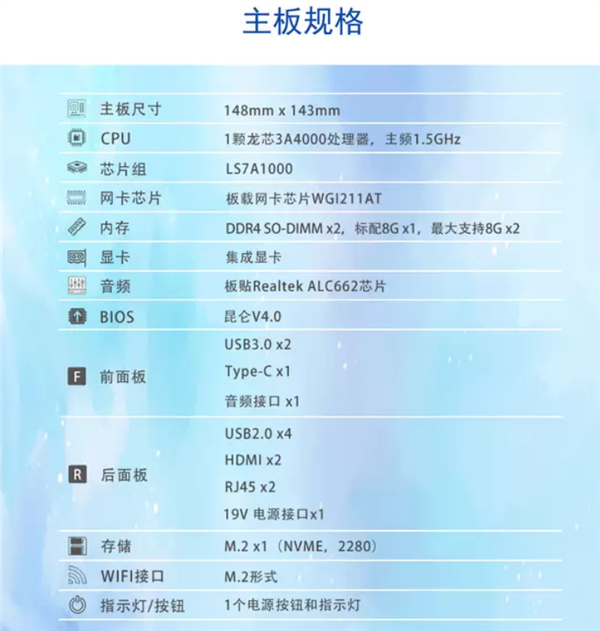 标配8GB DDR4 SO-DIMM内存、两个WGI211AT集成千兆网卡、Realtek ALC662集成声卡、昆仑V4.0 BIOS,支持M.2 Wi-Fi扩展,系统供电规格为DC 19V/4.74A。