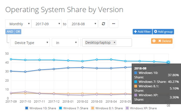 Win10发布于2015年,但直到2018年,Win10市场份额才终于超赶Win7