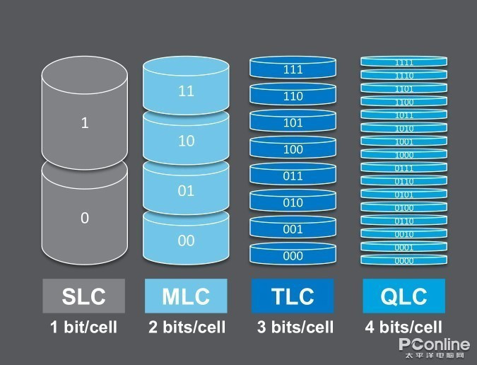 而随着闪存颗粒电子结构层数的增加,会让同数量单元存储的数据翻几番,降低相同容量SSD的制造成本。但与此同时,闪存写入时产生的电压变化也就逐级递增,其颗粒写入速度变慢,可靠性变差。像QLC闪存每个cell单元可以存储4位电荷,总共就是有2^4=16组电压变化,控制起来复杂让写入速度变慢,可靠性也更差,至于PLC就更不用说了,也正因为这样使得QLC SSD被很多用户所唾弃。