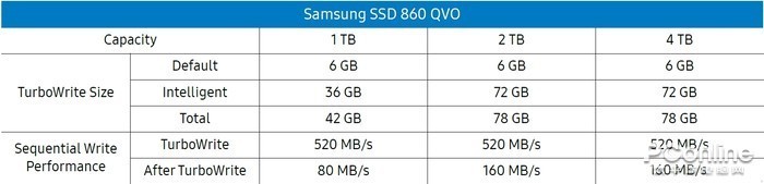 至于性能方面,三星 860 QVO SSD采用了Intelligent TurboWrite技术,也就是不少TLC SSD都采用的模拟SLC缓存机制,而1TB版本的SLC缓存为72GB,也就是说你在连续读写大小在42GB以下的文件都不会掉速,保持在一个500MB/s左右的水平,而2TB版本更有78GB的缓存,相信这对于大部分玩家而言是足够使用了。