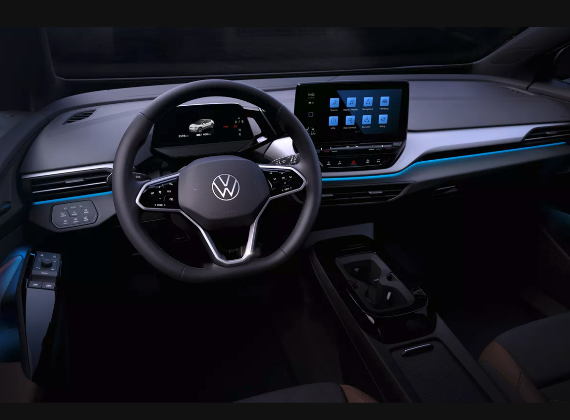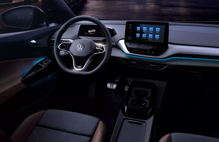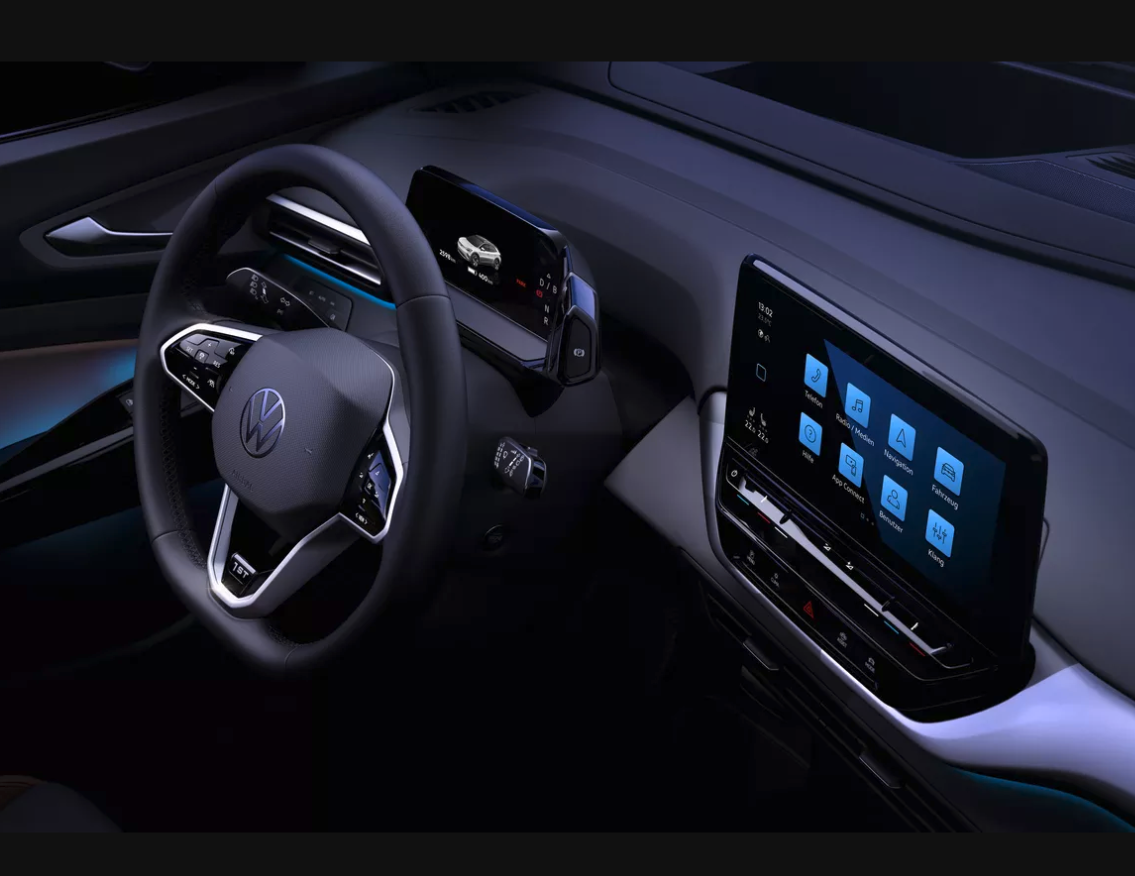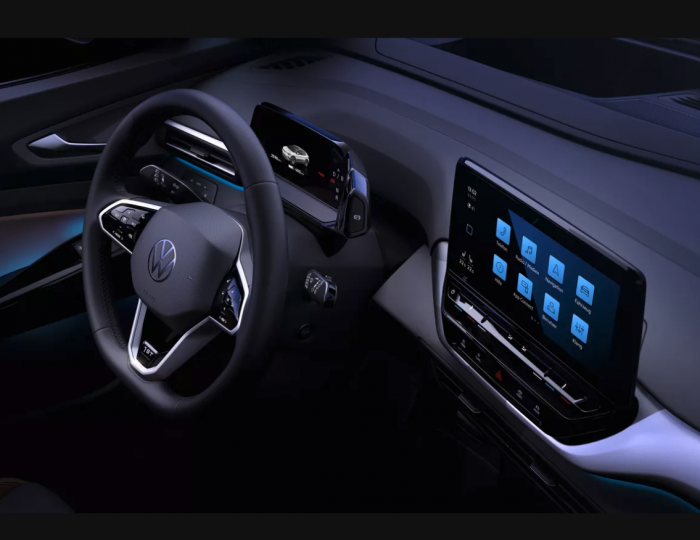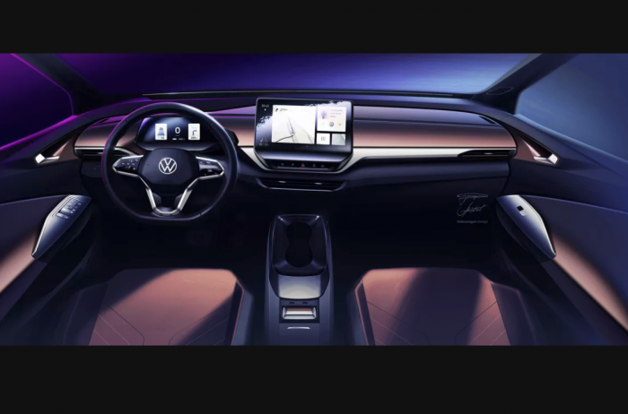 大众汽车的ID 4将于9月底全球首发,但在此之前,这家德国汽车制造商正在对这款新型电动SUV的内饰进行展示。不出所料,它的外观简约,似乎受到了特斯拉和市场上其他电动汽车的启发。大众没有提供任何关于车辆触摸屏或信息娱乐系统的信息。但从图片中我们可以看到,ID 4将有两个屏幕,一个是转向柱后的梯形屏幕,一个是中央堆栈中的水平屏幕。主屏幕将设有车辆设置、收音机、电池信息、导航等功能的应用。