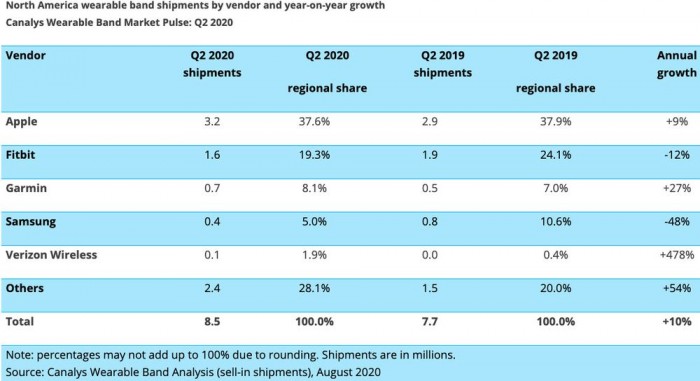 得益于 Apple Watch Series 5 的流行,苹果在北美可穿戴市场上处于领先地位。根据市场调查机构 Canalys 分享的2020年第2季度最新研报,Apple Watch 和 FitBit 等可穿戴设备在北美的受欢迎程度持续增长,市场规模比去年同比增长了 10%,部分原因是 50 美元以下健身手环的流行。