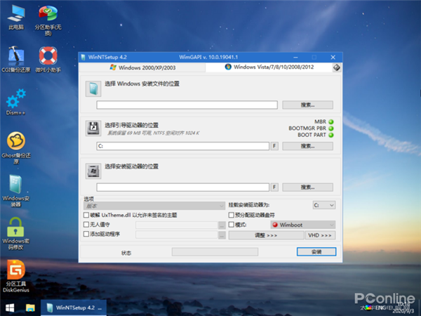 接下来,想要备份文件可以直接使用微pe里的资源管理器来进行,习惯了Ghost系统的用户也有Ghost软件在这里。想要安装系统的用户有傻瓜式的Windows安装器,也可以通过将要安装的系统ISO镜像挂载为虚拟磁盘的方式来进行手动安装的方法。新版微PE 2.1还为用户准备了Bitlocker支持组件,现在支持在PE内解锁Bitlocker盘了。