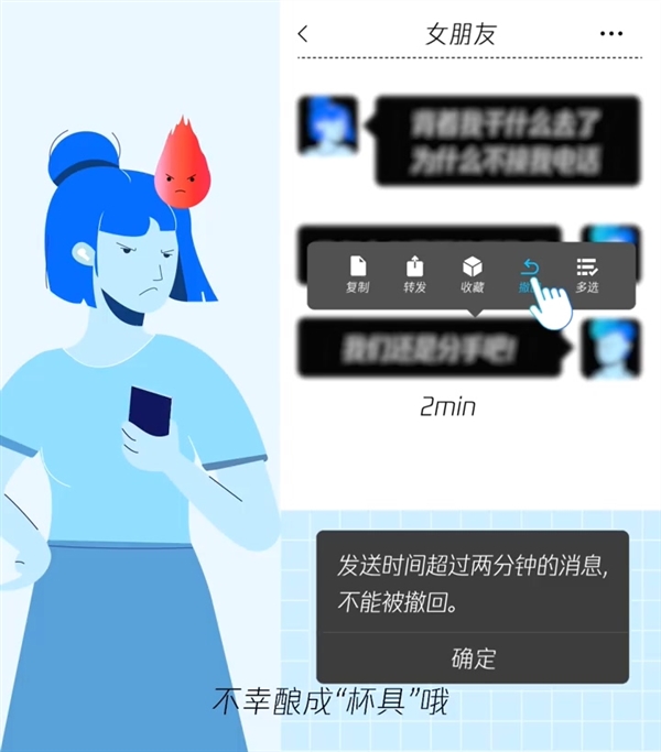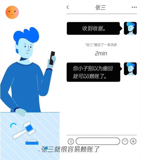 在解释的过程中,腾讯还特意列举了例子,比如张三给李四立收据,李四回复收到后,张三就撤回了。如果没有提示,张三就很容易赖账,所以他们就设定了一个界限,那就是发送时间超过两分钟的消息不能被撤回。