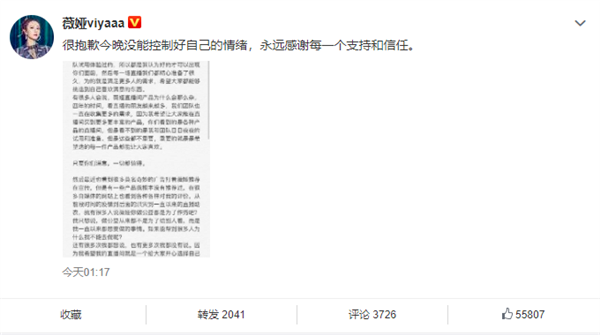 今天凌晨,薇娅发文道歉:很抱歉没能控制好自己的情绪,永远感谢每一个支持和信任。