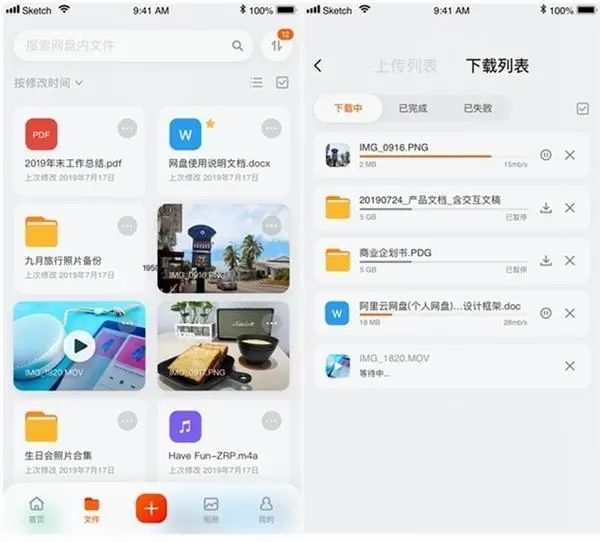 从目前曝光的资料来看,阿里云网盘包含了首页、文件、拍摄/上传、相册,以及个人中心5个主要功能模块。