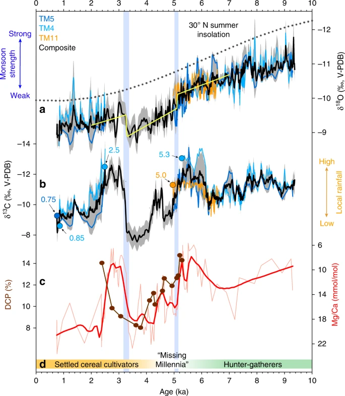 4000 多年,然后在大约 5100 年前到 3500 年前突然减少。这表明该地区可能经历了一场持续了 1000 多年的长期干旱。
