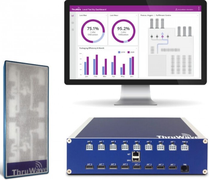 ThruWave 的传感器安装在传送带旁,通过天线和该公司所谓的 "压缩传感",对里面的物品进行3D成像。计算机视觉软件可以测量立方体的利用率,清点物品,检测丢失或损坏的物品。该系统每小时可以自动成像和分析多达2万个箱子。