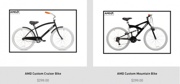 此前amdfanstore卖的多是什么T恤、帽子之类的产品,这两天突然上架了两辆自行车——AMD定制巡航自行车、AMD定制山地自行车。