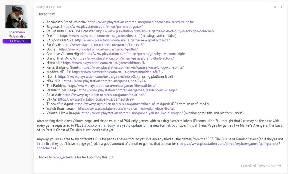国外游戏论坛ResetEra的玩家对PlayStation网站更新的游戏页面进行了总结,列出了一系列预计会在PS5上发售新的游戏,其中包括《神陨》、《刺客信条》、《孤岛惊魂6》和《生化危机:村庄》等备受玩家期待的游戏。