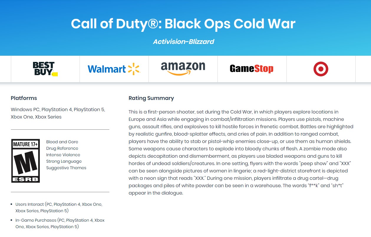 COD系列最新作《使命召唤17:黑色行动冷战》已经通过ESRB评级,为M级17+,评级内容显示《使命召唤17:黑色行动冷战》包含大量血腥、断肢、斩首、脏话,同时还有性暗示内容。