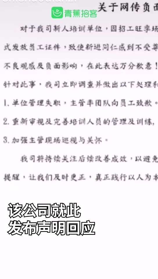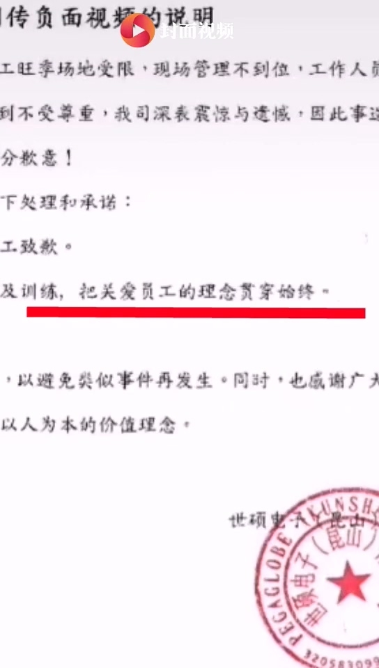 对此,昆山世硕电子公司发布了一则“关于网传负面视频的说明”,称公司新人培训单位因招工旺季、场地受限,现场管理不到位,工人员发放员工证件时方式不当,致使新进同仁感到不受尊重,公司深表震惊和遗憾,并表达万分歉意。