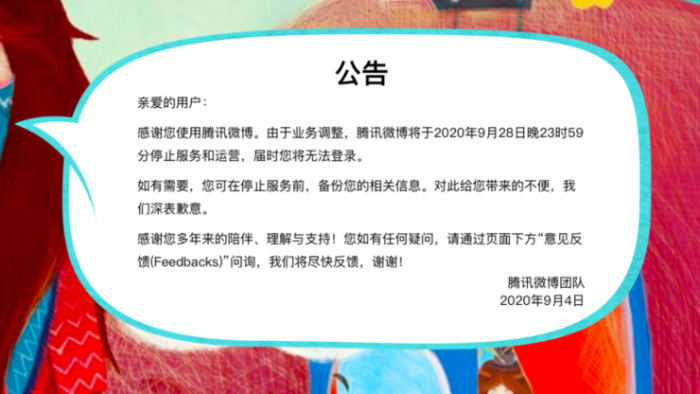 腾讯微博,终于迎来了它的死亡之日。9 月 4 日,腾讯微博团队发布公告称,由于业务调整,腾讯微博将于 2020 年 9 月 28 日晚上 23 时 59 分停止服务和运营,届时用户将无法登陆。