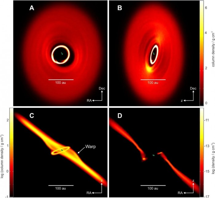 令人称奇的是,这些物质盘和三颗恒星的轨道都不在平面上,尤其是内环的倾斜角度最大,甚至在外环上投下了影子,这也为研究行星系演化提供了难得的实例。