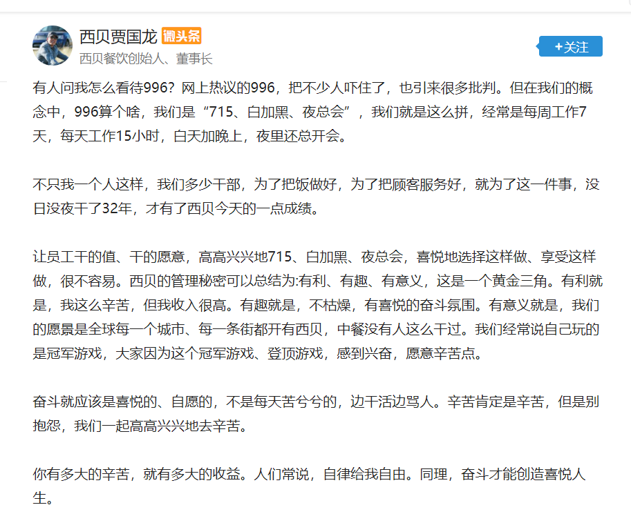 近日,西贝餐饮创始人、董事长贾国龙在社交媒体谈及996工作制时表示,网上热议的996,把不少人吓住了,也引来很多批判。“但在我们的概念中,996算个啥,我们是“715、白加黑、夜总会”,我们就是这么拼,经常是每周工作7天,每天工作15小时,白天加晚上,夜里还总开会。”