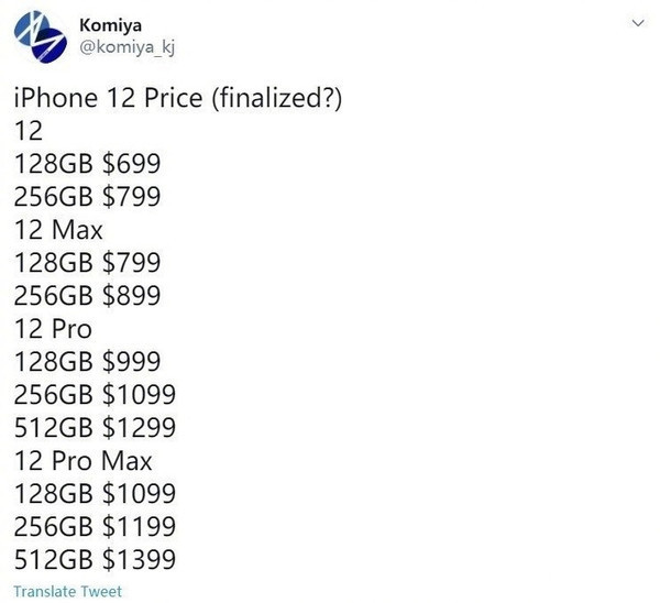 作为对比,此前有爆料称,iPhone 12 128GB版售价699美元(约合人民币4800元);iPhone 12 Max 128GB版售价799美元(约合人民5500元);iPhone 12 Pro 128GB版售价999美元(约合人民币6800元);iPhone 12 Pro Max 128GB版售价1099美元(约合人民币7500元)。