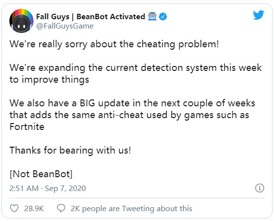 《糖豆人:终极淘汰赛》非常火爆,深受玩家们的喜爱,大量作弊问题也随之出现。近日开发商Mediatonic表示将要进行游戏更新,采用与《堡垒之夜》相同的反作弊工具,解决作弊问题。“对于作弊问题,我们很抱歉!”《糖豆人:终极淘汰赛》官方表示: