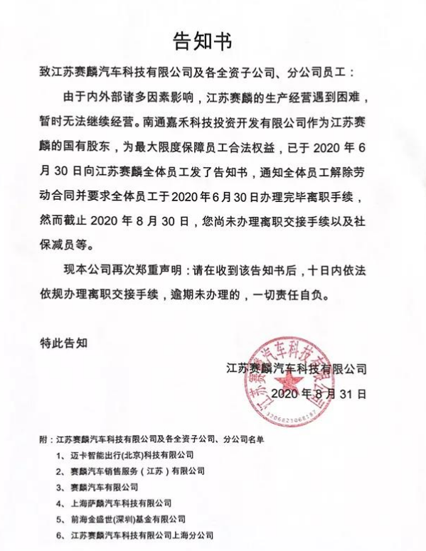 该告知书内容显示,由于内外部诸多因素影响,江苏赛麟的生产经营遇到困难,暂时无法继续经营。南通嘉禾科技投资开发有限公司作为江苏赛麟的国有股东,为最大限度保障员工合法权益,已于2020年6月30日向江苏赛麟全体员工下发告知书。但仍有员工尚未办理离职交接手续以及社保减员等。