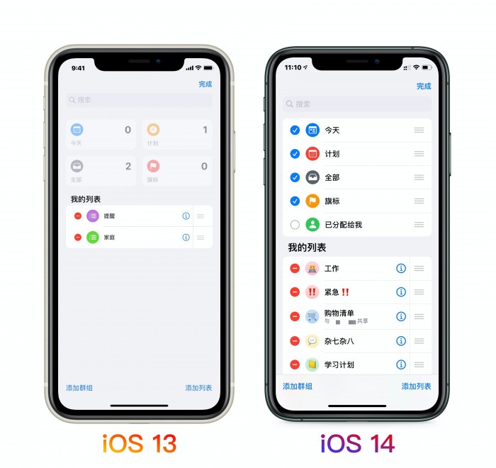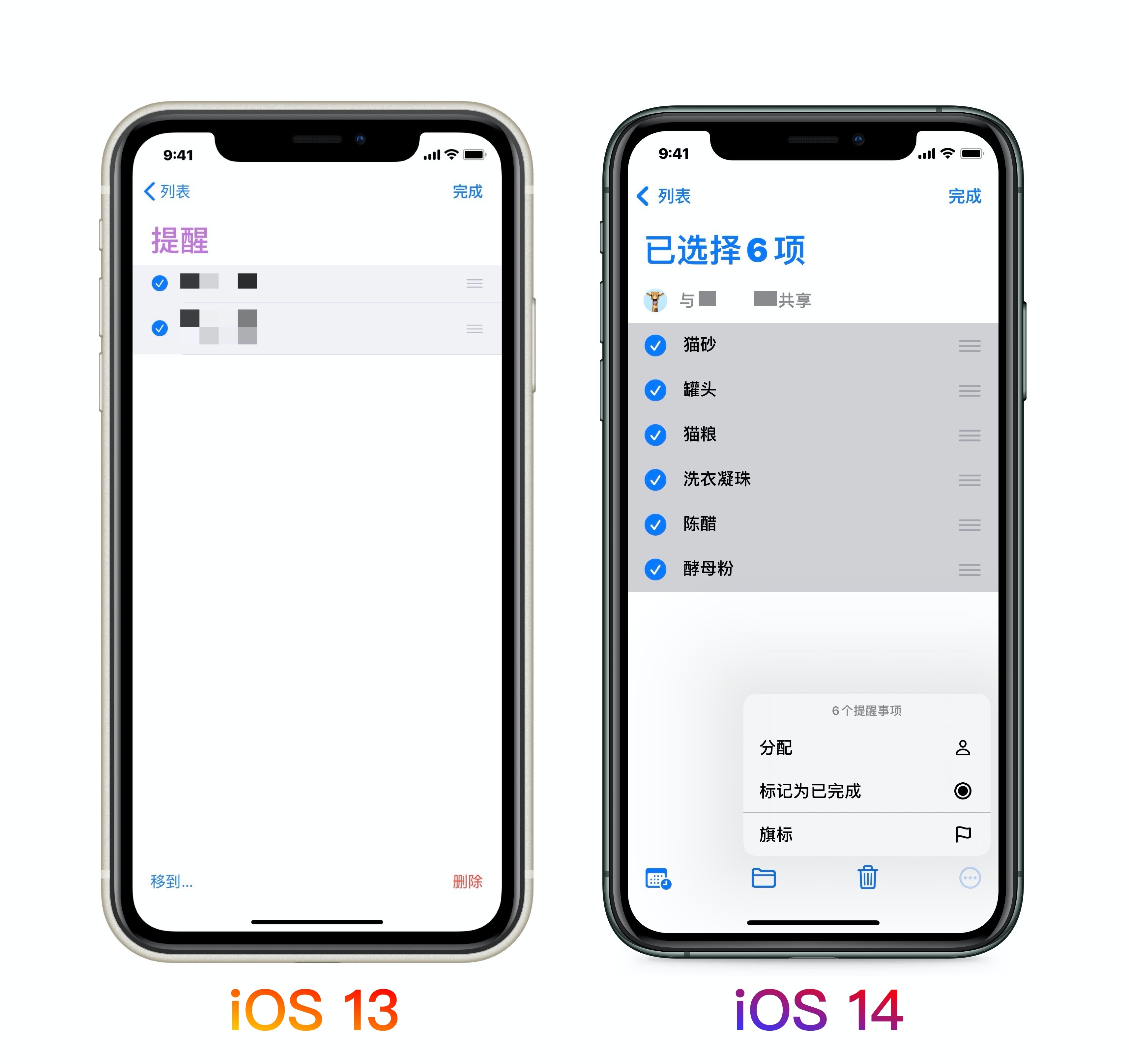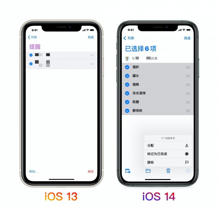 第二个是功能上的优化。进入特定列表,iOS 14 新版的提醒事项现在支持对多个项目进行管理,例如同时对多个项目标记完成、标记旗标、分配等。在 iOS 13 中这是不可行的,虽然后者也支持项目多选,但只能用于不同任务组间的移动。