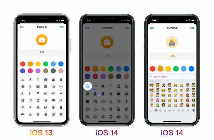 苹果在 iOS 13 中为列表加入了自定义图标和颜色的个性化选项,iOS 14 则更进一步,加入了更多的图标并且支持将表情符号作为列表图标。