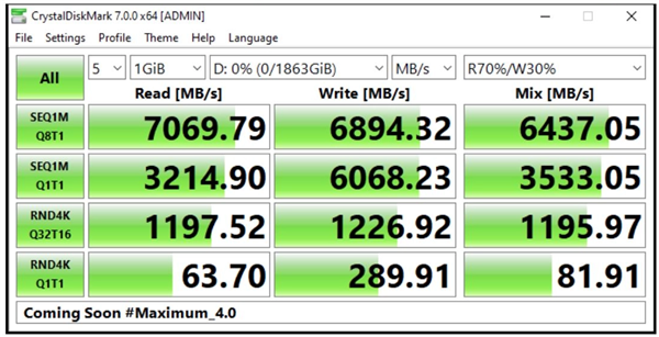 今天,群联又秀了一把E18的肌肉,放出了详细的读写性能数据。其中,持续读写速度突破了7GB/s,持续写入速度也达到了6.9GB/s 。