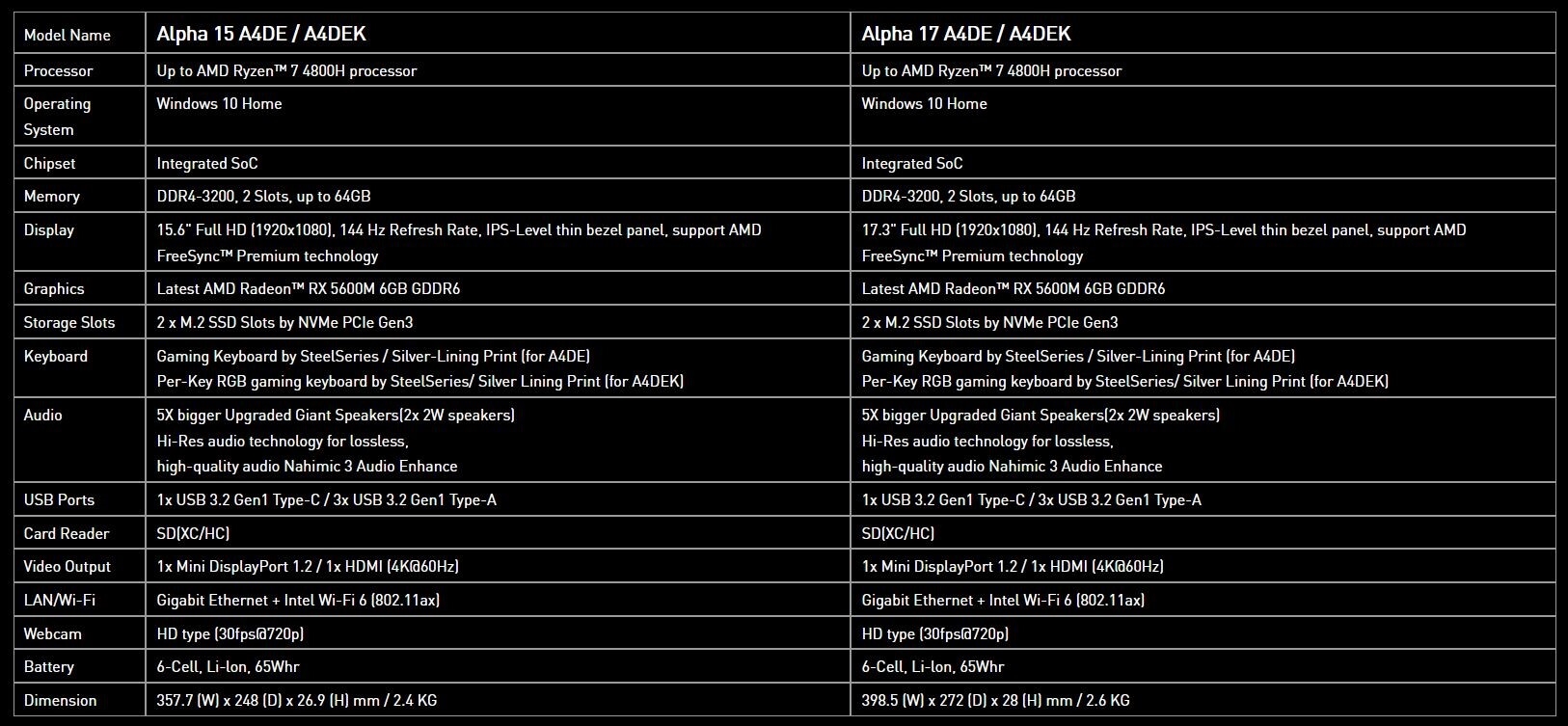 AMD的锐龙4000U、锐龙4000H系列处理器在游戏本领域春风得意,但是RX 5000系列显卡就无所作为了,比如最新的RX 5600M,之前仅有戴尔的一款G5 15 SE,也因为各种原因未能成为爆品。今天,微星发布了新款游戏本Alpha 15、Alpha 17,不但配备顶级的锐龙7 4800H八核处理器,还搭载了RX 5600M独立显卡,具备6GB GDDR6显存,这也是第二款7nm 3A游戏本。