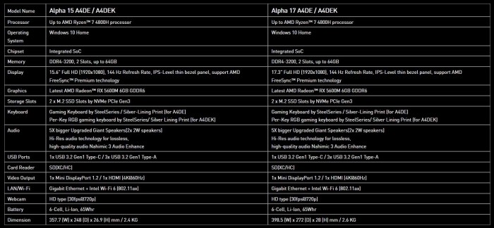 其他配置方面,两条DDR4-3200内存(最大容量64GB),两条PCIe 3.0/NVMe M.2插槽,千兆以太网加Intel Wi-Fi 6无线网卡,65Whr六芯锂离子电池,两个2W扬声器、Nahimic 3音效技术。