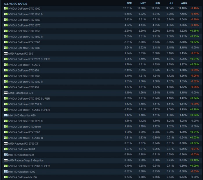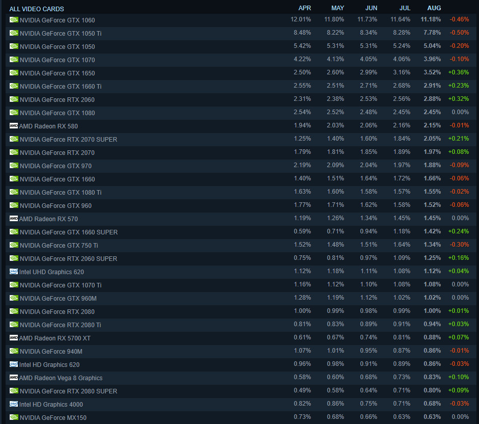 V社发布了2020年8月Steam硬件调查,尽管N卡继续主宰着GPU市场,高达73%的占有率,但具体来说,Steam上最受欢迎的N卡依旧是GTX 1000系列,其次是GTX 900系列,而RTX 2000系列的占有率则比较低。