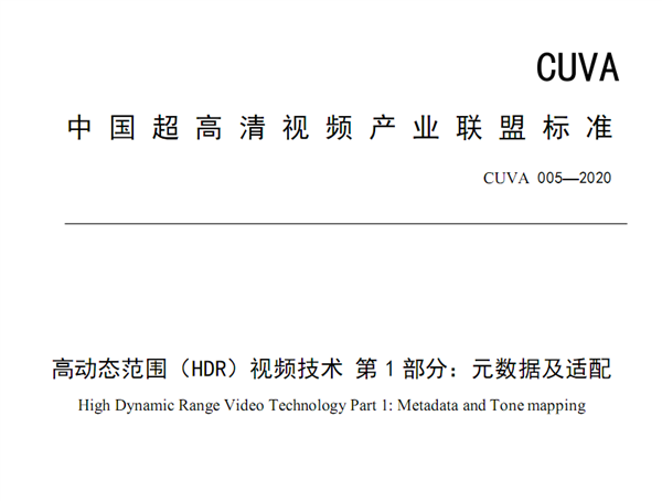 2019年12月12日,中国电子技术标准化研究院联合央视总台、广电总局广播电视规划院、超高清视频产业链上下游龙头企业,共同成立了“CUVA HDR标准工作组”,开展HDR技术方案和算法标准研究,并于2020年7月2日组织召开了联盟标准审查会,将标准名称确定为《高动态范围(HDR)视频技术》。