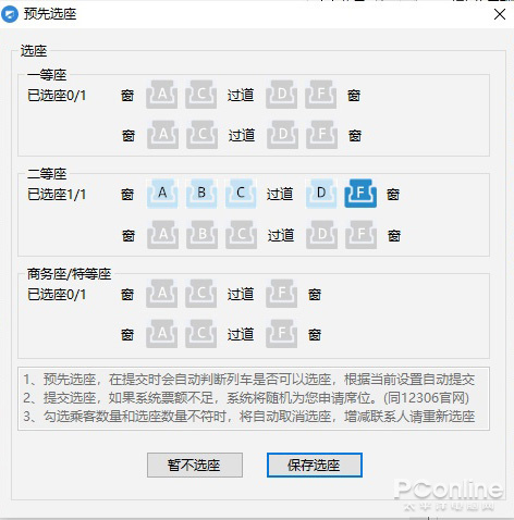 高铁和动车是支持选座的,尽管热门线路通常都是一票难求,但如果我们有特殊需要,那么这项功能就显得比较实用了。和12306一样,Bypass的选座页面也是可视化设计,选好座后点击“保存”按钮,即可只针对该座位抢票。不过为了保险起见,热门线路建议先不要选它,以免错失抢票机会。
