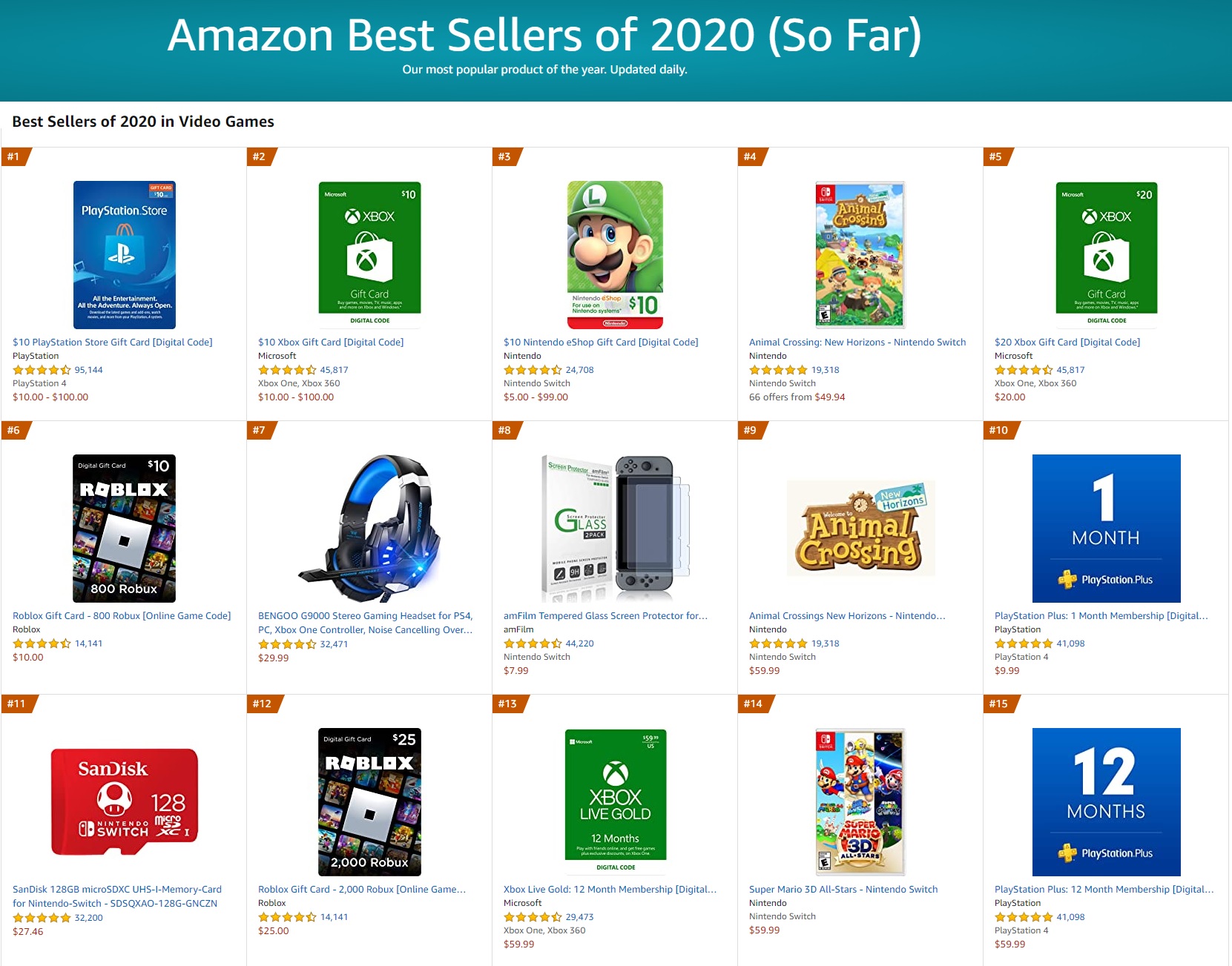 打开亚马逊商城游戏品类的年度销量排行榜可以看到,除了几个平台的充值卡以外,销量第四的Switch游戏《集合啦!动物森友会》是第一个游戏软件,而上周才刚刚对外公开预售的《超级马里奥3D合集》以14名的成绩成为2020年度销量第二的游戏软件。