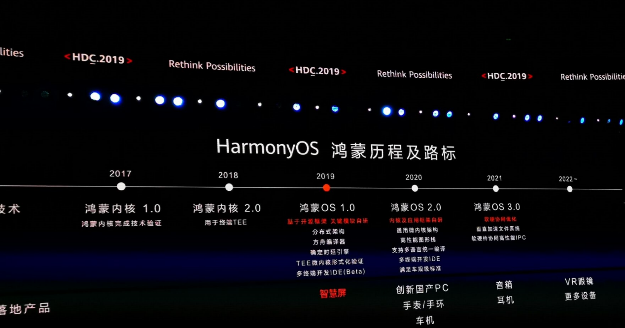 去年的开发者大会上,余承东披露的PPT显示,鸿蒙内核1.0诞生于2017年,2018年迭代到2.0版本。2019年开发者大会上,华为正式发布鸿蒙OS1.0,主打分布式架构、方舟编译器、确定时延引擎等,由智慧屏首发。