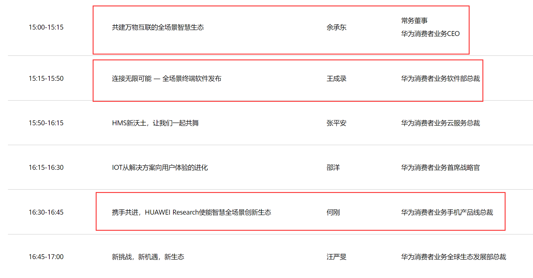 根据华为官网公布的日程信息,包括消费者业务CEO余承东、华为消费者业务软件部总裁王成录、华为消费者业务云服务总裁张平安、华为消费者业务首席战略官邵洋、华为消费者业务手机产品线总裁何刚、华为消费者业务全球生态发展部总裁汪严旻在内的众多终端业务高管将悉数登场。