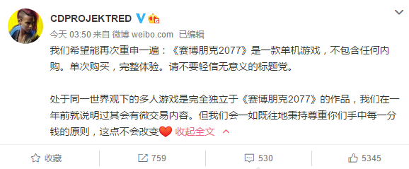 不过官方也提到了另外一件事,那就是氪金还是存在的,只是不是《赛博朋克2077》单机版,而是一款基于同一世界观下的多人游戏,里面有微交易模式,官方强调他们一年前就说明过了。