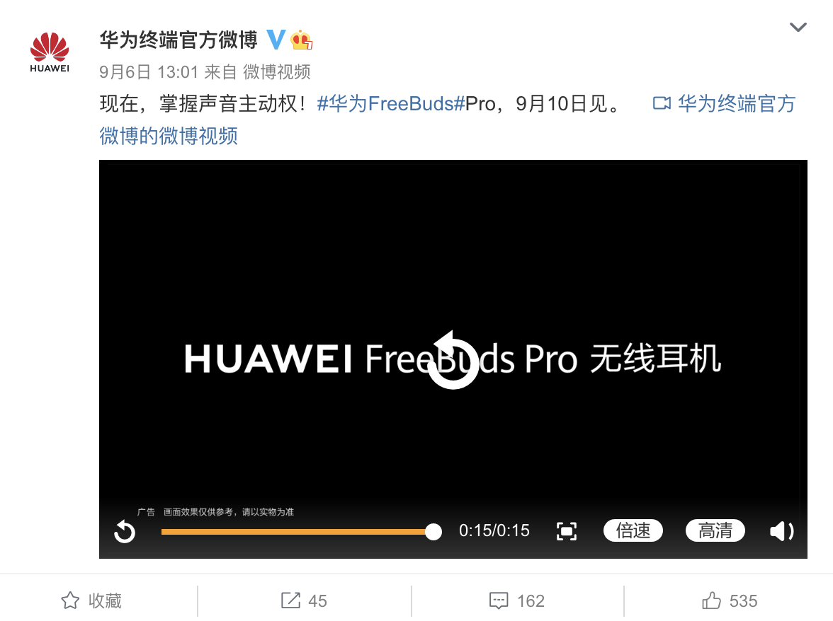 9月6日,华为终端官方微博发布了一条Freebuds Pro的预热视频,文案为“现在,掌握声音主动权”,而在科幻感满满的预热视频中,华为Freebuds Pro的外观有所曝光,视频中多次突出了“Pro”的地位,似乎意味着它的性能相比此前Freebuds系列更加强大。在视频结尾,更打出了“动态降噪,听我想听”的slogan,其中首次提及的动态降噪技术,无疑是华为Freebuds Pro产品中最神秘的所在。