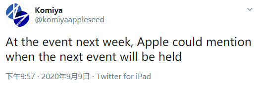 知名爆料人 Komiya(@KomiyaAppleSeed)在 Twitter 上透露,这家科技巨头或在 9 月 15 日的线上活动结束后不久发布一篇新闻稿,以确认下一场发布会的举办时间。