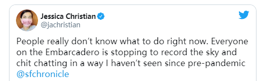 正如一些旧金山居民所指出的, 橙色天空导致了城市周围的奇怪氛围。如此诡异的景象,让人不禁驻足凝视,它看起来真的像是世界末日科幻片里的东西。