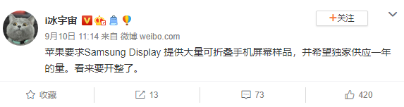 @i冰宇宙 在微博上爆料称,苹果要求三星显示器公司提供大量的可折叠手机屏幕样品,并希望独家供应一年的订单量,暗示着这家库比蒂诺科技巨头已经开始对折叠屏智能机市场产生了浓厚的兴趣。其实早在去年,就有报道称三星正在将自家可折叠显示技术分享给包括苹果在内的其它企业,以换取预期中的更多订单。