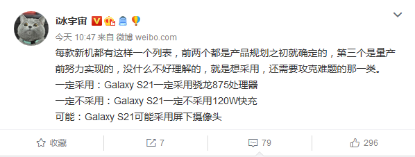 今天国内知名数码博主@i冰宇宙发布微博,表示三星明年年初推出的 Galaxy S21 一定会采用高通骁龙875处理器,一定不会搭载 120W 的快充,但有可能会采用屏下摄像头。