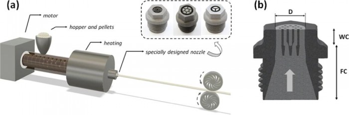 挤出后,光纤被拉过相邻的一组辊子。这样,在冷却和设置时,光纤就会被拉紧,这样,光纤内部的任何通道就不会自行塌陷。据称,整个过程不仅比传统技术更快、成本更低、结构更紧凑,而且纤维的长度只受限于可送入挤出机的颗粒数量。